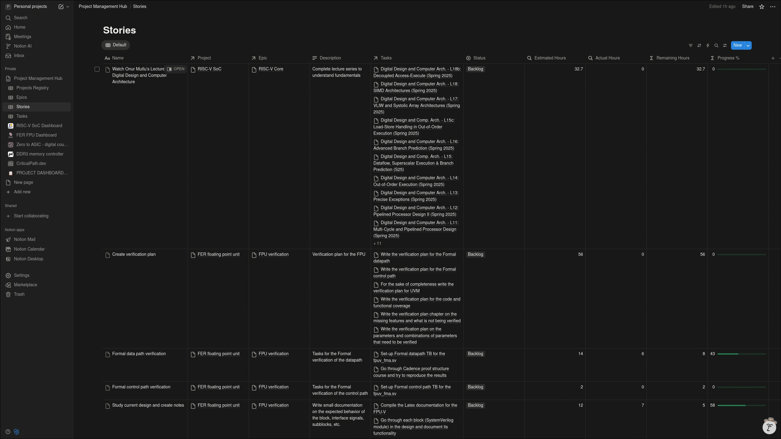 The Stories database contains all Stories for all Projects. Each Story is assigned to one (or more) Epics. Estimated Hours, Actual Hours, Remaining Hours and Progress are automatically calculated. Like in the Epics database, the Estimated Hours and the Actual Hours are are calculated by summing the values of the same-names properties for all Tasks contained within a Story.